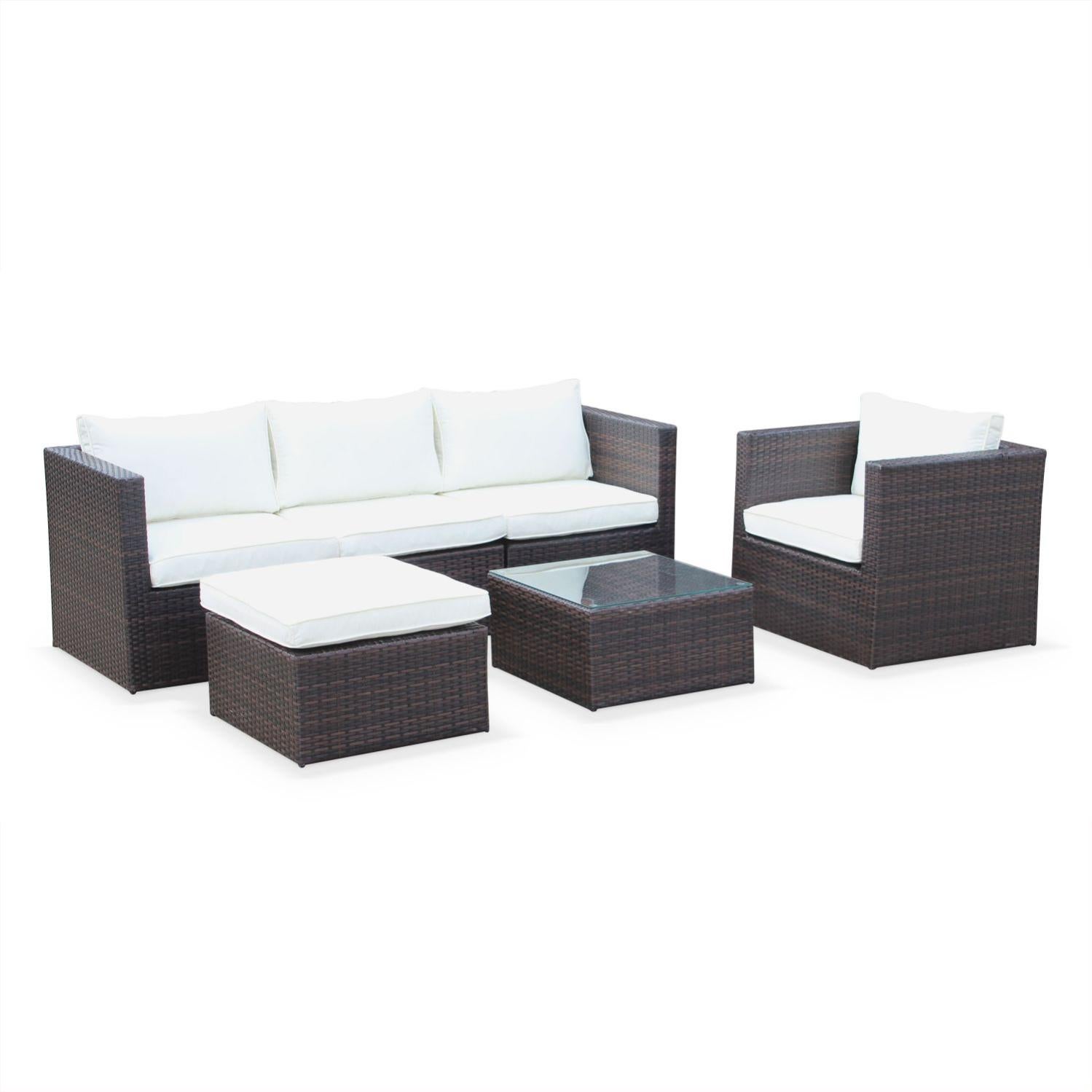 salon de jardin resine tressee benito marron coloris chocolat coussins ecrus structure aluminium canape leroy merlin