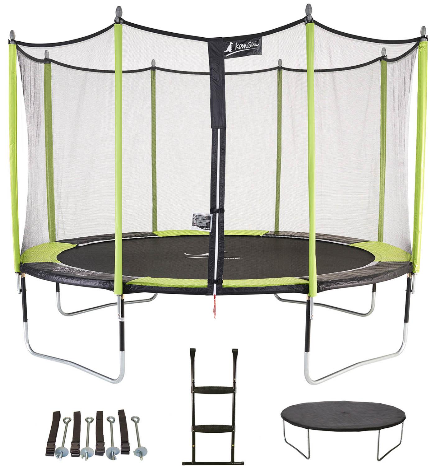 kangui trampoline de jardin 426 cm filet de securite echelle bache de protection kit ancrage jumpi vert noir leroy merlin