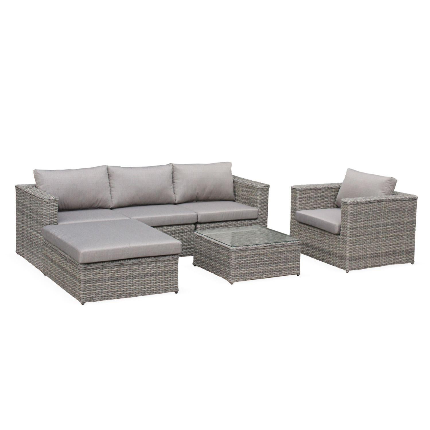 salon de jardin en resine tressee arrondie 5 places romini gris coussins beige chine meridienne pouf fauteuil leroy merlin