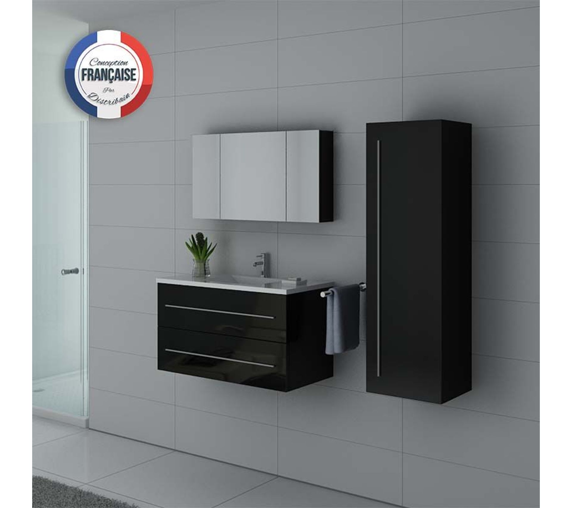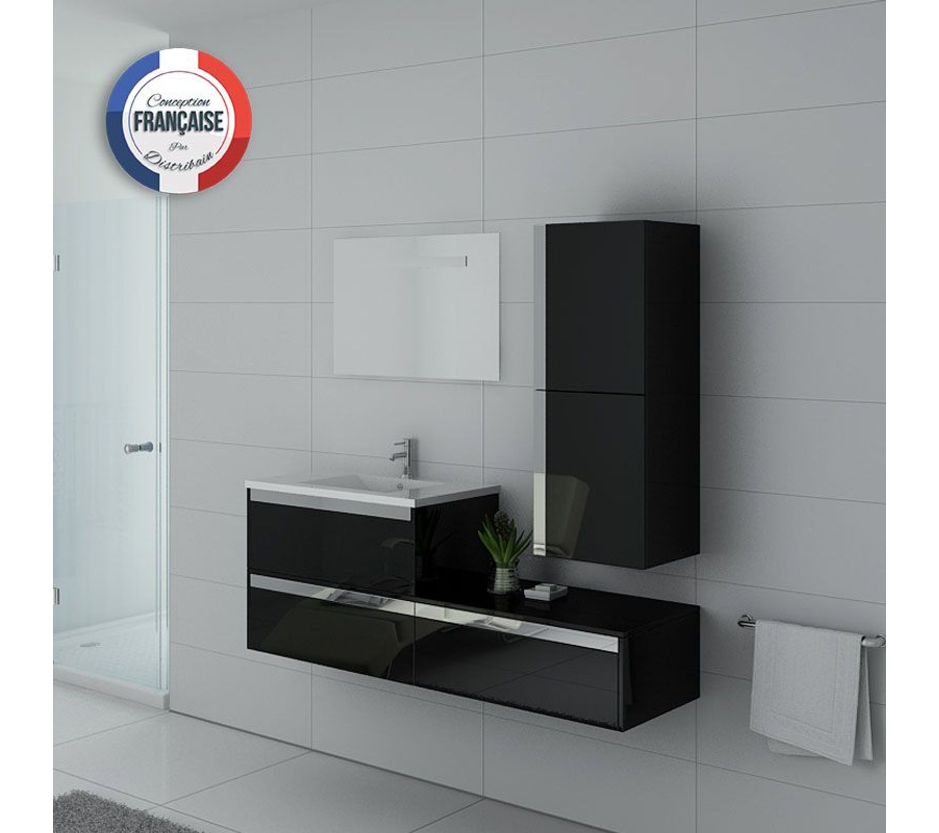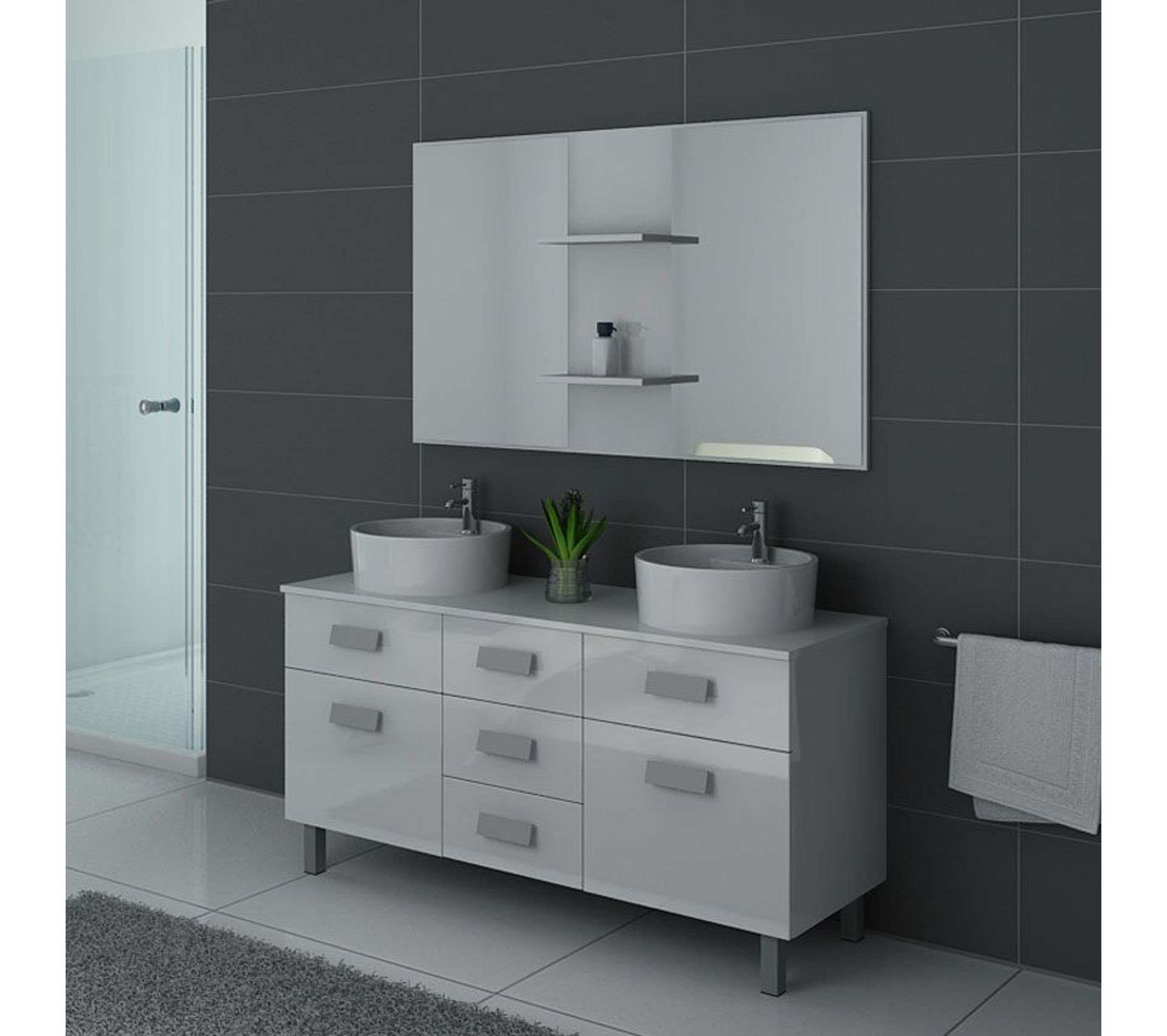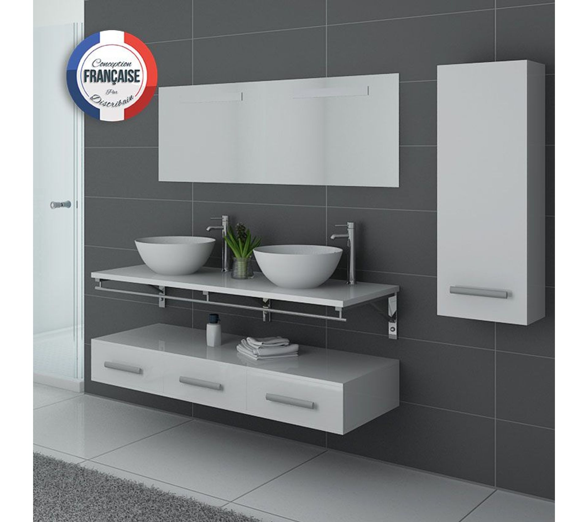 ensemble terrace 150 cm 1 plumier bois massif 2 tiroirs laque brillante blanc vasque