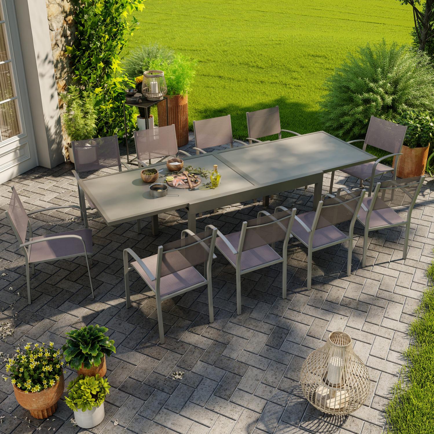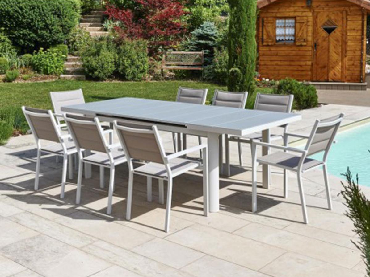 table de jardin extensible aluminium 270cm 10 fauteuils empilables textilene gris taupe lio 10 leroy merlin