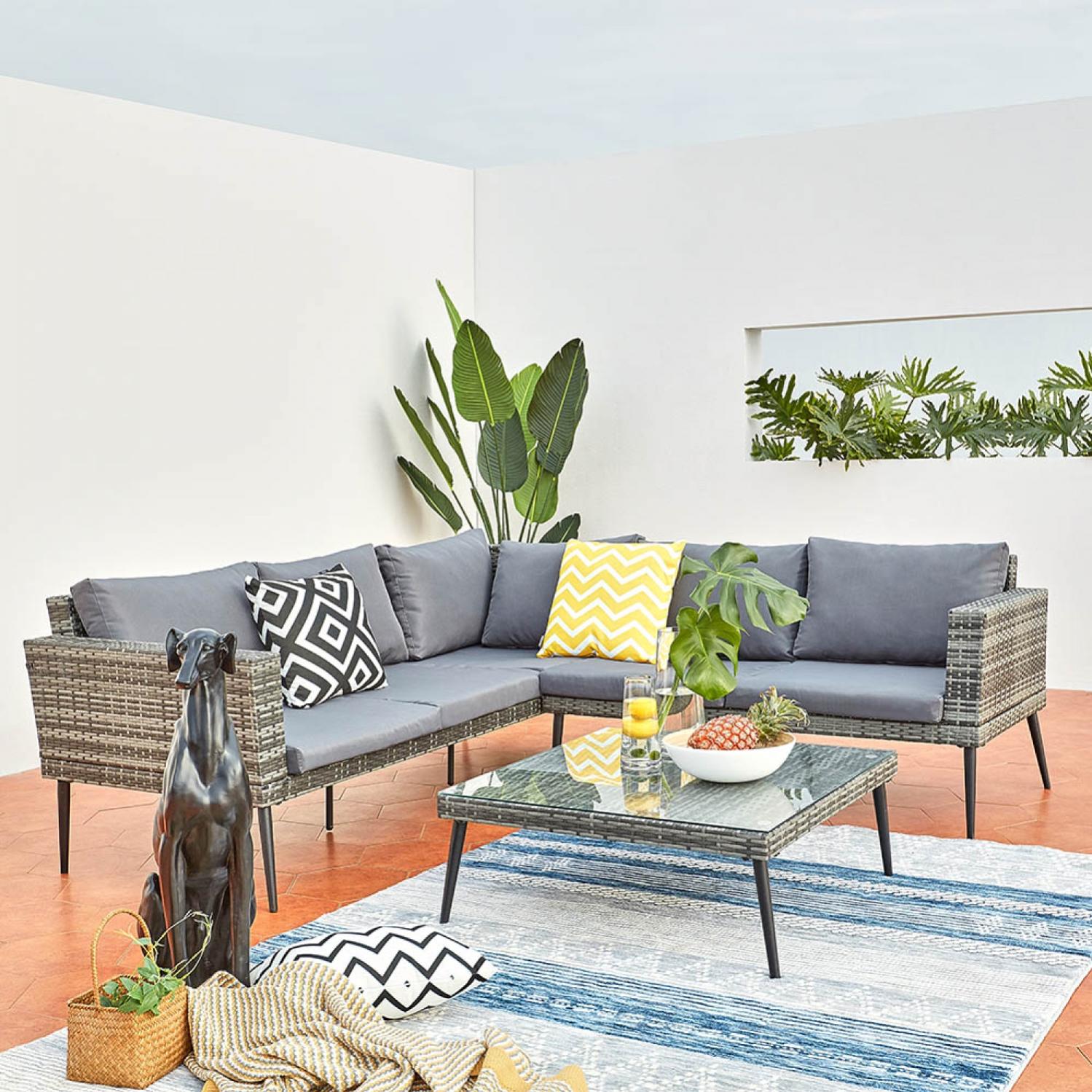 salon de jardin en resine tressee perugia gris coussins gris 4 places 1 canape 2 fauteuils une table basse leroy merlin
